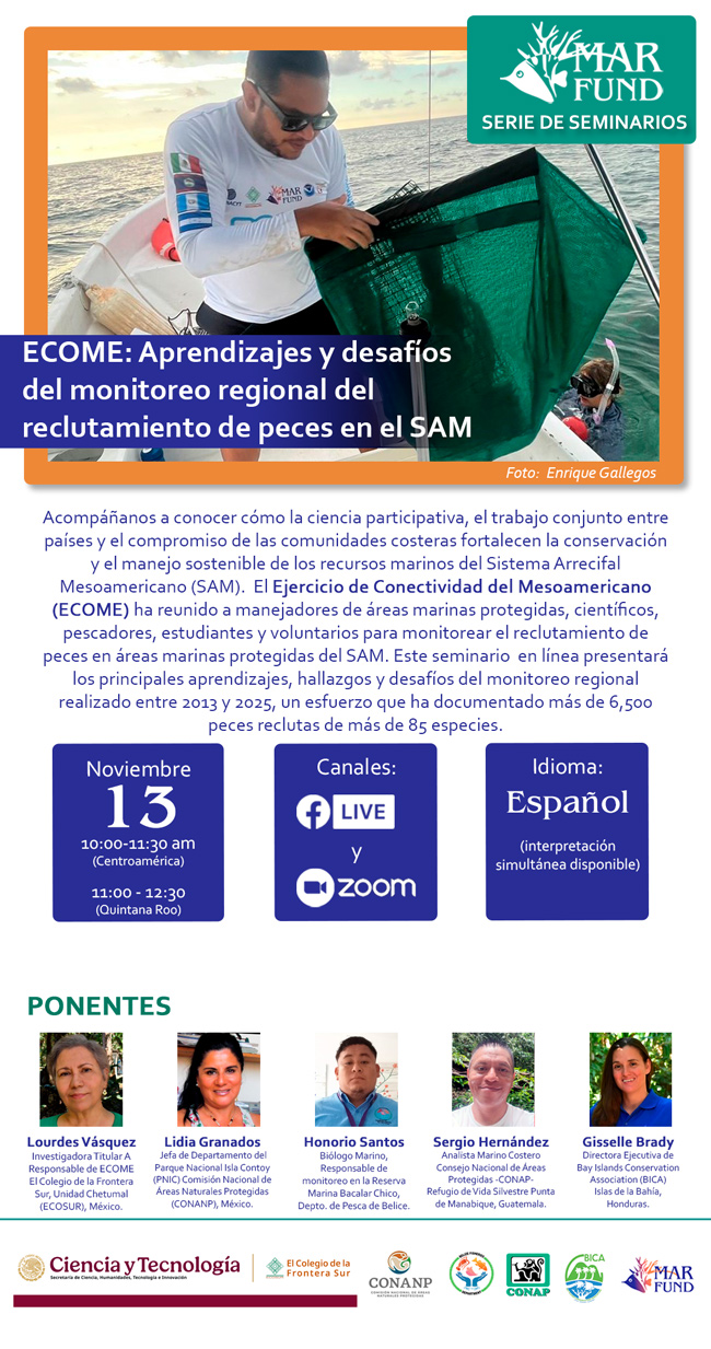 ECOME: Aprendizajes y desafíos del monitoreo regional del reclutamiento de peces en el SAM. Este evento virtual dio a conocer cómo la ciencia participativa, el trabajo conjunto entre países y el compromiso de las comunidades costeras fortalecen la conservación y el manejo sostenible de los recursos marinos del Sistema Arrecifal Mesoamericano (SAM). El Ejercicio de Conectividad del Mesoamericano (ECOME) ha reunido a manejadores de áreas marinas protegidas, científicos, pescadores, estudiantes y voluntarios para monitorear el reclutamiento de peces en áreas marinas protegidas del SAM. Este seminario en línea presentará los principales aprendizajes, hallazgos y desafíos del monitoreo regional realizado entre 2013 y 2025, un esfuerzo que ha documentado más de 6,500 peces reclutas de más de 85 especies.